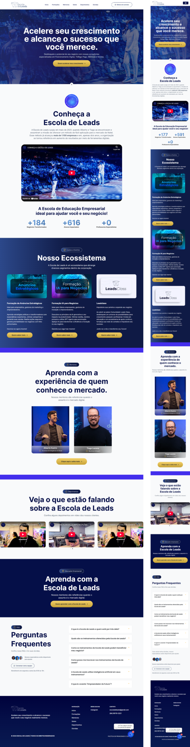 Realizamos sessões de alinhamento com a equipe da Escola de Leads para mapear seus cursos, mentorias e diferenciais pedagógicos. A partir disso, desenvolvemos um web site institucional com foco em comunicação estratégica, usabilidade e conversão, organizado para destacar os benefícios de cada programa e facilitar a inscrição de novos alunos.